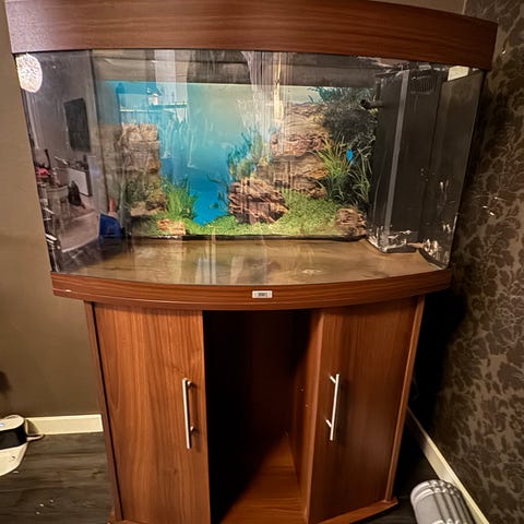 Det kommer med allt man kan behöva till akvariet. Filter, växter, fiskar grus dekor värmare lampa samt en snigel