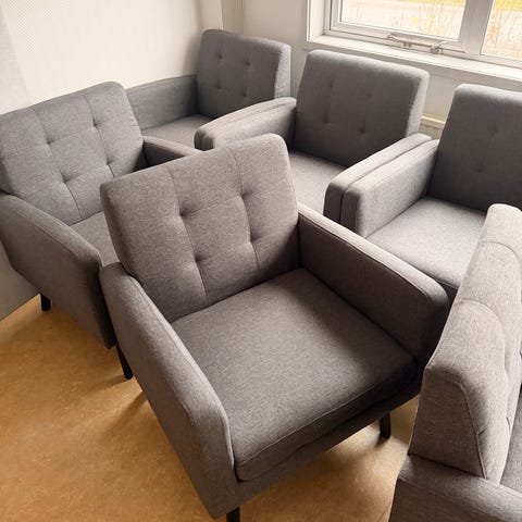 Fåtöljen och fotpallen är nästan inte använda och har mest stått oanvända.