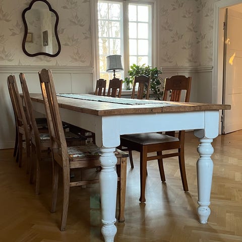 Stort och rustikt bord med plats för många. Vi har som mest suttit 12 personer vid det.