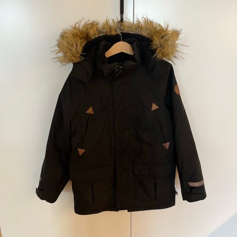 Ett set med fodrade jacka och byxor från polaren och pyret, för skidåkning eller lek ute i snön. Jackan har en avtagbar huva, dragkedja fram och fickor. Byxorna har justerbara hängslen och resår i midjan.