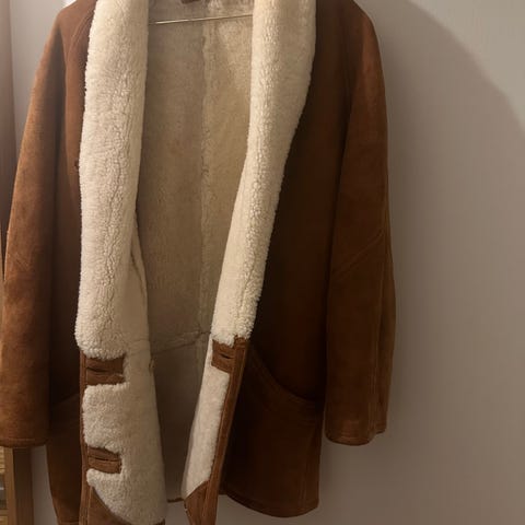 Damkappa i storlek 36 i brun mocka med äkta fårskinn på insidan. Kappan har en knäppning framtill och ett bälte i midjan för justerbar passform. Varm och skön jacka. Sydd I Malugn