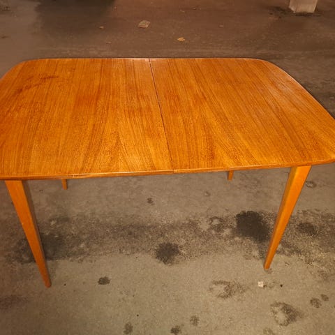 Säljer nu vårt köksbord i teak med två iläggskivor som på bilderna är ditsatta. Säljes enbart bordet utan stolar med teakhyllorna matchande till. Smärre slitage, smärre märken finns pga ålder! Priset är satt där efter. Mått Längd på bordet m iläggskiva 201 cm Utan iläggskiva 121 cm Bredd 85 Höjd 74 Bara bordet.