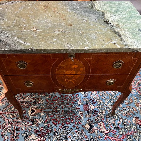 Byrå med marmorskiva och tre lådor i trä, liten och nätt.