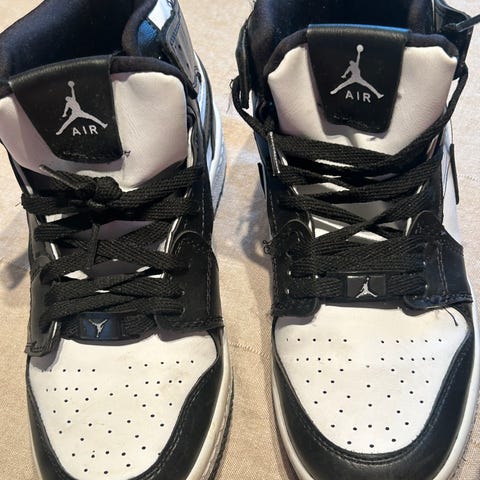 Air Jordan Sneakers i storlek 39. Skorna har en färgkombination i svart, vitt och rött. Designade som sportskor med snörning och gummisula. Väldigt sparsamt använt!