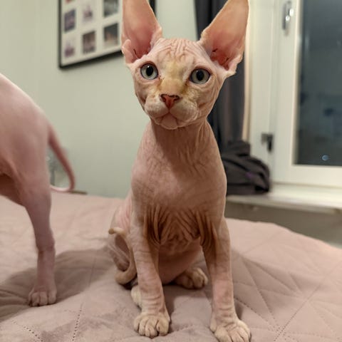 Deras tassar är nästan som små människohänder, de älskar att krypa under filtar och mysa, de tittar dig rakt i ögonen – en unik egenskap bland djur! De är inte blyga utan fullkomligt älskar att hälsa på gäster och charmigt kommunicera med alla i familjen. Sphynx-katter har ett hjärta av guld och blir lätt vänner med andra husdjur, så om ni redan har en kompis hemma eller funderar på att adoptera två syskon, är det bara en bonus!