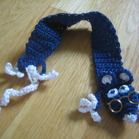 Handvirkad manet i blått och vitt, tillverkad i akrylgarn. Dekorativt hantverk som kan användas som prydnad eller leksak.