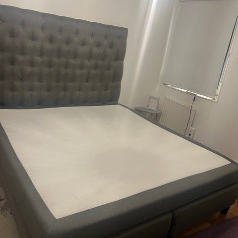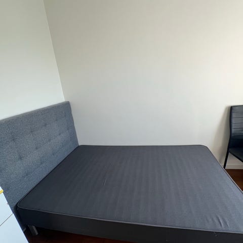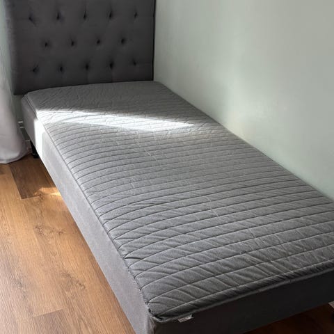 Enkelsäng med stoppad, grå sänggavel i tyg och dekorativ knappstoppning. Sängen har tygklädd ram och träben samt ribbotten för madrass. Passar som enkel säng i sovrum eller gästrum. Madrass ingår
