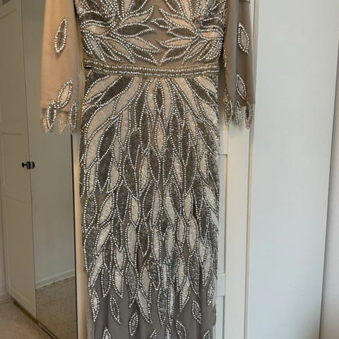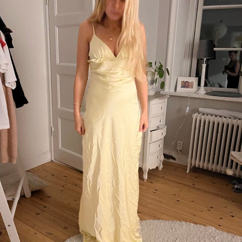 Använd en gång och i superbra skick, i princip som ny. Klänningen har en snygg slits och kommer med skyddspåse så den kan förvaras fint.
