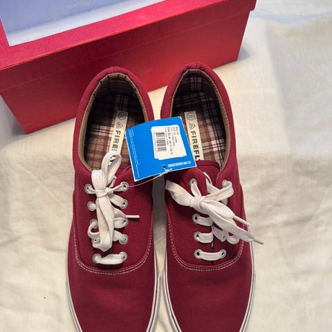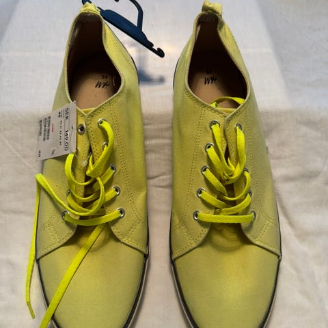 H&M Sneakers i storlek 44 i beige färg. Skorna har snörning och en gummisula med mönster för grepp. Materialet är syntetiskt och designen är enkel och stilren, lämplig för vardagligt bruk.