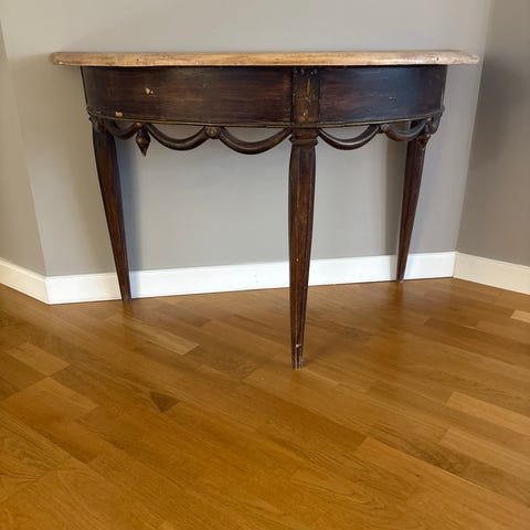 Spår av användning och bruksslitage finns kvar. Bordsskivan har hack & report som tillför bordet extra charm. Bordet är för den som vill ha en fräsch upplaga av en gammal möbel och finner charm i dess skavanker.