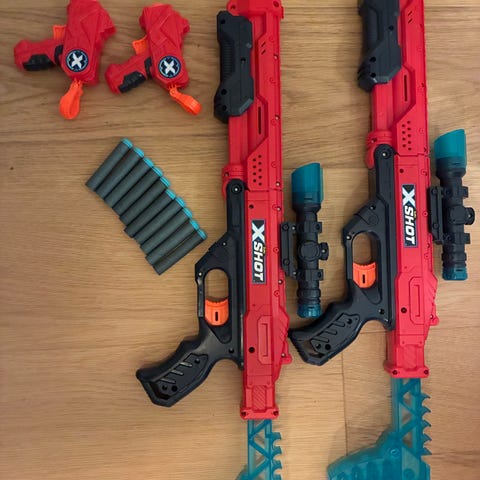 Säljer ett Laser X-set med västar och pistoler. Man sätter på västarna på bröstet och skjuter mot motståndaren tills livplattan slocknar. Pistolerna låter lite när man skjuter och blir träffad, vilket gör spelet extra kul och realistiskt. Laddas enkelt genom att skaka pistolen, och använder vanliga batterier som räcker länge. Perfekt för barn och ungdomar som gillar action och tävlingar.