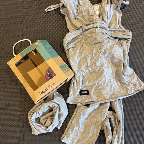 En färdigknuten trikåsjal från Najell, perfekt för den första tiden med bebis! Allt man behöver göra är att placera sin lilla, göra en knut och sen är det klart! Denna är i en fin beige färg. Köpt i juli 2023 och använt till ett barn.