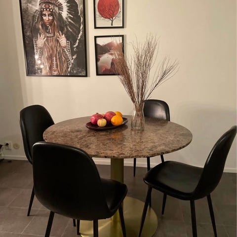 Fint matbord i marmormönster härdat glas, med underrede i svartlackerad metall. Köpt på Mio.