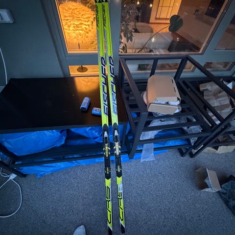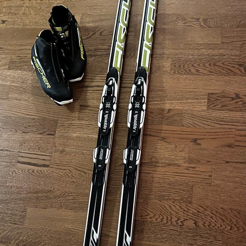 Fischer skidor och skidskor. Skidorna är av märket Fischer med bindningar längd 167 cm. Skidskorna har storlek 38.