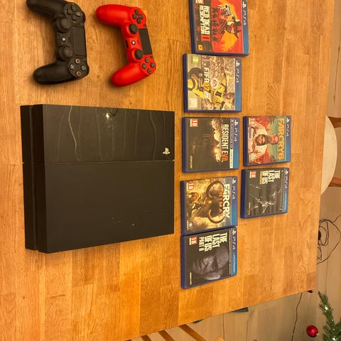 Playstation 4 spelkonsol i svart färg. En kontroll och 10 spel ingår