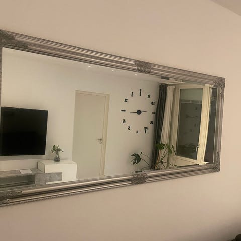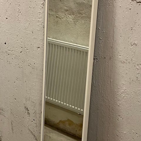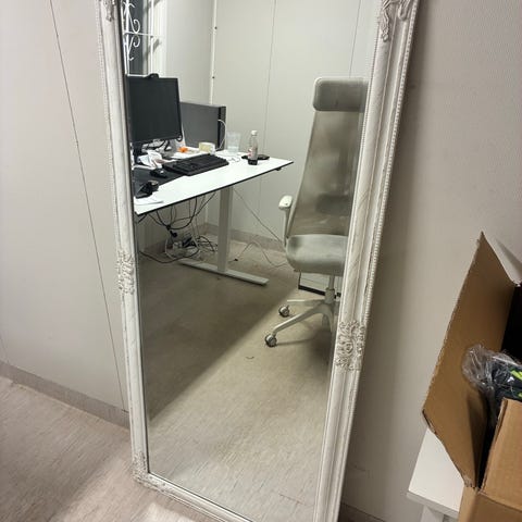 Jysk spegel med ram och gångjärn. Spegeln är avsedd för väggmontering eller som fristående med stöd. Färg och storlek är inte specificerade i tillgängliga uppgifter.
