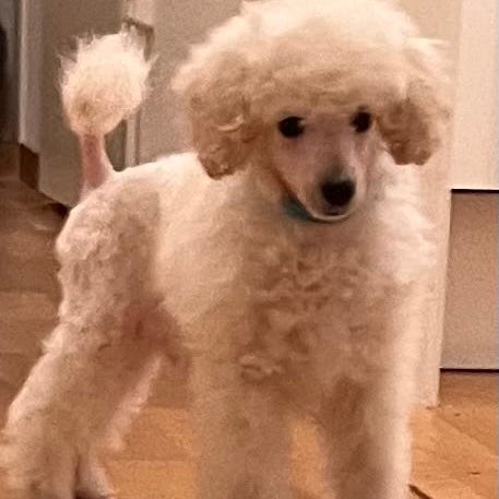 Mycket lovande vit dvĂ€rgpudel tik med vackert uttryck och ett vĂ€nligt, harmoniskt temperament. Han vĂ€xer upp i hemmiljö och Ă€r van vid dagliga rutiner, hantering samt normal ljudmiljö. Social, nyfiken och trygg â med fin kontakt och god följsamhet.