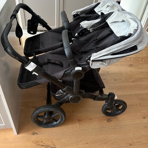 Syskonvagn bugaboo donkey Duo 2 beige med två sittdelar, regnskydd och paraply. Liggdel ingår ej. Punkteringsfria däck. Säljes billigt vid snabb affär pga flytt. Kan hämtas efter överenskommelse i Kortedala.