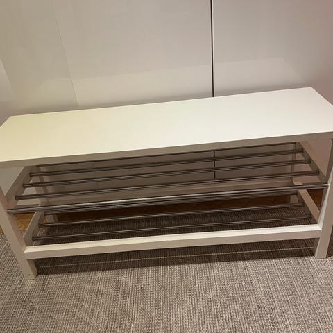 Skohylla i originalförpackning omonterad/oöppnad. Nypris 699 kr. Vit och stål. Inkl. dyna med ljusgrå tygklädsel. B100 x H50 x D34 cm. för montering se https://cdn4.jysk.com/ttr/ai/6843478.pdf