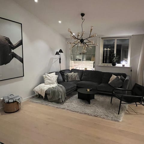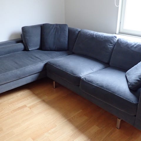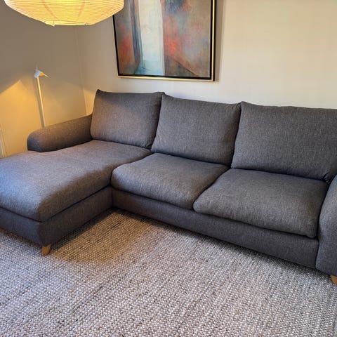 Mio Madison 3-sits med Divan i mörkgrått tyg. Soffan är utformad som en L-formad hörnsoffa med flera sittdynor och en längre schäslongdel på ena sidan. Klädseln är i tyg med släta sitt- och ryggdynor. Passar för vardagsrum med behov av flera sittplatser och en sammanhängande sofflösning längs två väggar.