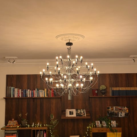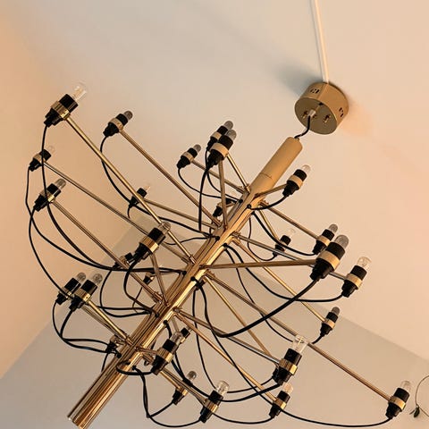 Säljer nu vår fantastiska Sarfati-ljuskrona (modell 2097/50) från italienska Flos. Detta är den stora, maffiga modellen med 50 ljuskällor som verkligen tar för sig i rummet och sprider ett magiskt sken.