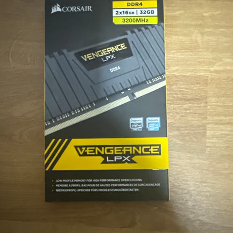 Corsair Vengeance LPX RAM-minne med en total kapacitet på 32GB, bestående av 2 minnen om 16GB vardera. Typen är DDR4 med en hastighet på 3600MHz.