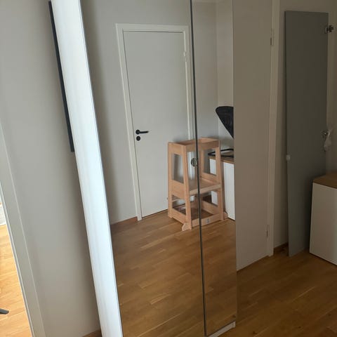 Säljer komplett PAX garderob som knappt använts. Ena dörren är i spegelglas. Två meshbackar, hyllplan och klädstång.