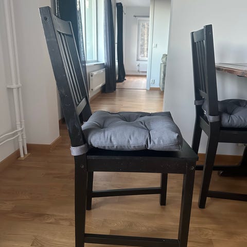 Ett robust köksbord i furu, 120 cm i grundmått, går att fälla upp båda sidorna så att bordet blir 220 cm. Fyra stolar hör till bordet, ytterligare två snarlika stolar ingår också. Bordsskivan bör slipas men bord och stolar är i övrigt i bra skick.