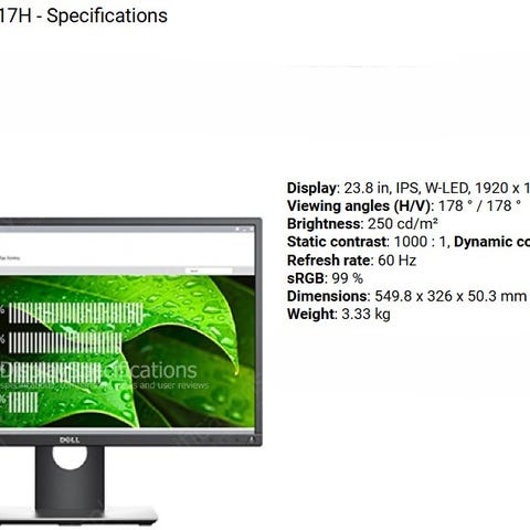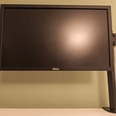 Dell 24-tums bildskärm med anslutningskablar och monteringsarm. Skärmen har en upplösning som kan justeras via inbyggd meny. Anslutning via DVI-kabel eller VGA. Färg: svart. Monteringsarmen mycket robust.