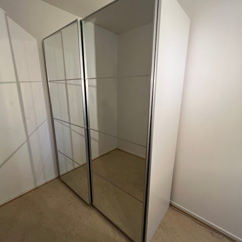 Pax /garderob /med spegel / vit/200 cm/ plasten finns kvar på metal skenan kvar som skydd/köparen tar isär den själv/ sitter lite löst eftersom den skruvades inte åt ordentligt från början, kanske det underlättar nu/ finns i Brunsbo Hisings Backa/