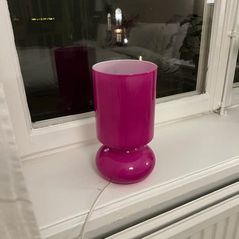 Bordslampa i fuchsiafärgat opalglas. En ljuspunkt. Etikettmärkt undertill.