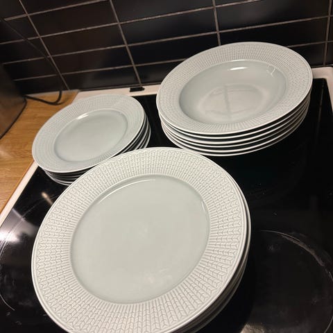 Rörstrand tallrik med blått blommönster. Tallriken har ett dekorativt blommönster i blått på vit botten. Passar för servering av mat i hem eller restaurangmiljö.