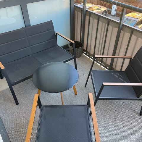 Runt trädgårdsbord och 3 stolar. Bordets diameter är cirka 60 cm. Passar för utomhusbruk och mindre utrymmen.