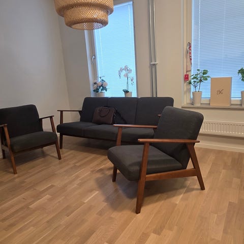 Bild på fåtöljerna i lägenhet innan de lagrades