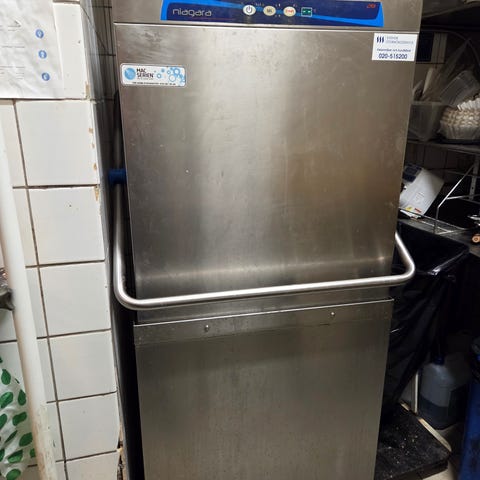 Bartscher diskmaskin i rostfritt stål. Maskinen är avsedd för kommersiellt bruk och har en frontöppning med korg för diskning av köksredskap och tallrikar.
