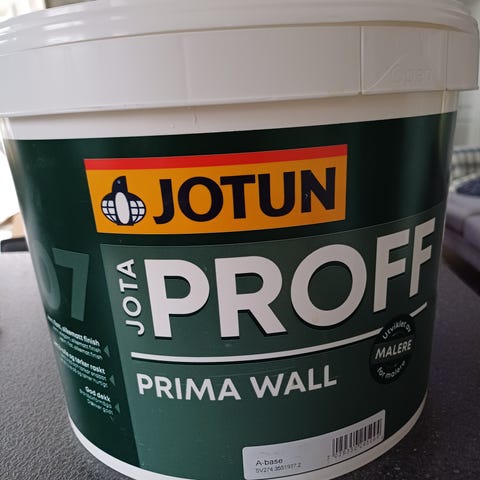 JOTUN PROFF, PRIMA WALL, vägg/takfärg, bruten grå, Jotun 1269 Gryning ( ljusgrå färg), avtorkningsbar. Två öppnade hinkar, ca18 L tillsammans. Köpta oktober 2024. Täcker ca 8m²/L. Blev över efter väggmålning. Öppnade en gång. Allt för 1800 kr.
