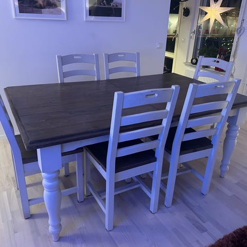 Matgrupp Cornwall från Mios tidigare produktion. Matbord med inbyggd extra skiva om 60 cm. Bordet kan alltså förlängas till 240 cm. 8 matstolar. Många delar av serien säljs secondhand för komplettering.