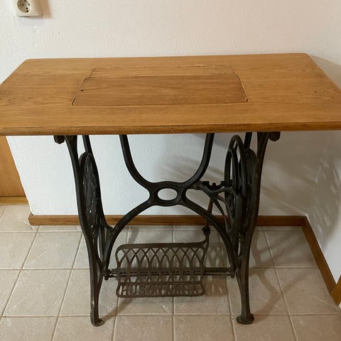 Fint symaskinsbord med underrede i gjutjärn från HUSQVARNA. Symaskinen saknas, jag har täckt hålet i bordet med en marmorskiva som medföljer om så önskas. En nyckel finns.