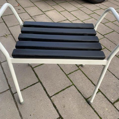Duschpall med handtag i vit färg. Pallen har en U-formad sits för komfort och stabilitet. Benen är utrustade med halkskydd för säker användning i våta miljöer.
