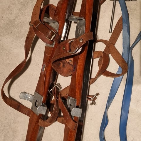 Compass långfärdsskridskor i fint skick. Inte använda många gånger. Konstruktion i metall med justerbara remmar för fäste på skor.Ställbar skena. Skena ca 50 cm. Skostorlek >40