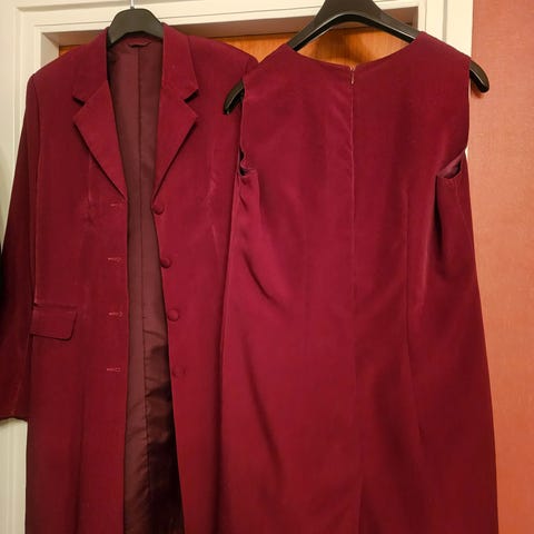 Tredelad ull kostym i ljusbrun färg, storlek XXL för dam. Kostymen består av kavaj, byxor och topp i samma material och färg. Måtten på sista bilden!
