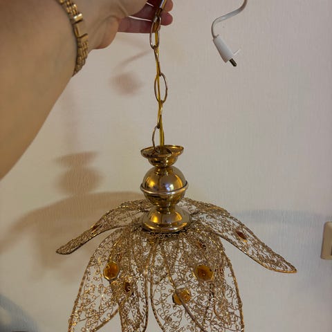 Dotter säljer sin taklampa. Rosa/lila stenar.