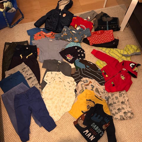 barnkläder för pojke i storlek 74 och 80. Paketet innehåller 3 par byxor, 2 par strumpbyxor, 1 t shirt, jeansjacka, jacka, 2 lpngärmade tröjor, 4 Bodies och en overall. Skicket varierar, från oanvänt till förskolekläder med fläckar. Fläckarna syns på infogade bilder.