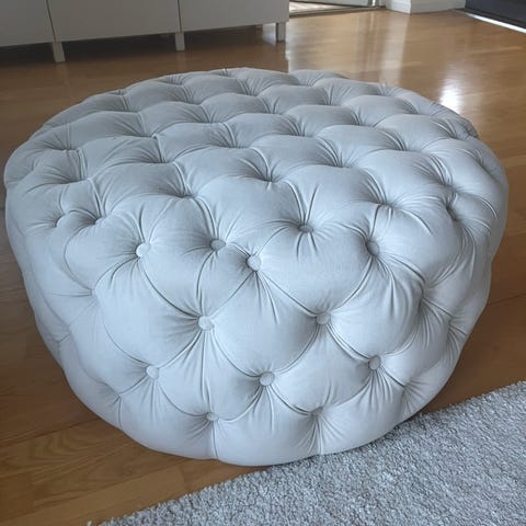Olivgrön uppstoppad sittpuff i sammet. Nätt och behändig, samtidigt stadig.