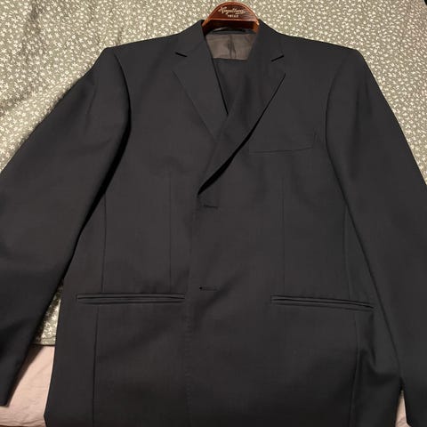 Stilren svart kritstrecksrandig kostym i mycket fint skick säljes. Storlek 56 i kavaj och byxa. 100% Ull i yttertyget. Märke: Atlant. Rökfritt hem.