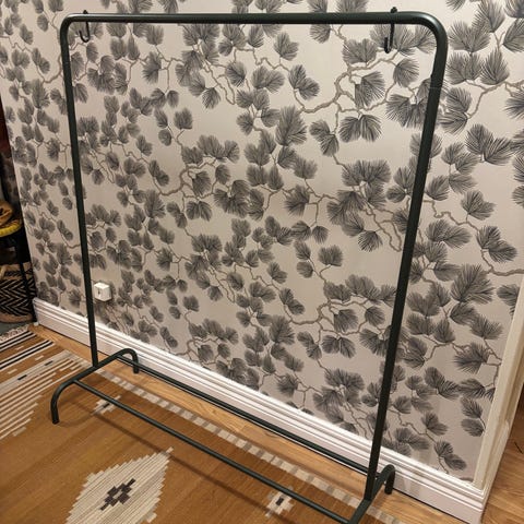 Retro klädställning i kromad metall med gummihjul. Justerbar i höjd och bredd. Avsedd för butik eller studio. Skicket är slitet: kromet har repor, fläckar och partier där ytan släppt (se bilder). Fungerar men är aningen vinglig.