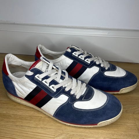 Gucci ace Sneakers i storlek 42. Skorna är vita med dekorativa detaljer i rött och grönt samt en broderad bieffekt. Tillverkade i material som ger en sportig och vardaglig stil. Passar för casual användning.