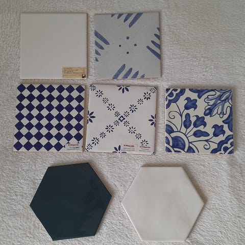 Set med designprover av kakel och ytmaterial, 15 × 15 cm.