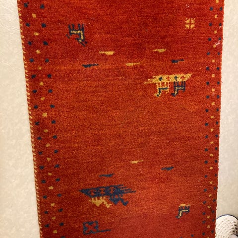 Vacker handknuten ullmatta i gabbeh-/nomadstil med varm röd botten och dekorativa djur- och trädmotiv i blå/gröna toner. Mattan är mjuk, slitstark och har ett tidlöst, minimalistiskt uttryck som passar både moderna och klassiska hem.