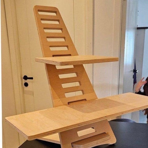 Skrivbord att ställa ovanpå ett bord för att ergonomiskt kunna stå upp och arbeta. Enkelt att justera höjd genom att flytta brickan för datorn och för eventuell mus/tangentbord. Plockas lätt ihop för förvaring.